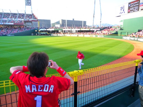 芝生が美しい。そして前の男性のユニフォーム「MAEDA」の文字も美しい。広島にはいま「前田」が二人いますが「背番号1」は広島カープの魂「前田智徳 」です。