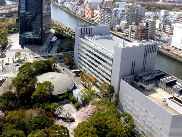 1988年完成の読売テレビ放送の現本社ビル。14階建ての高層棟(オフィス機能)と6階建ての低層棟(放送スタジオ)で構成されています。敷地面積は8264m2です。