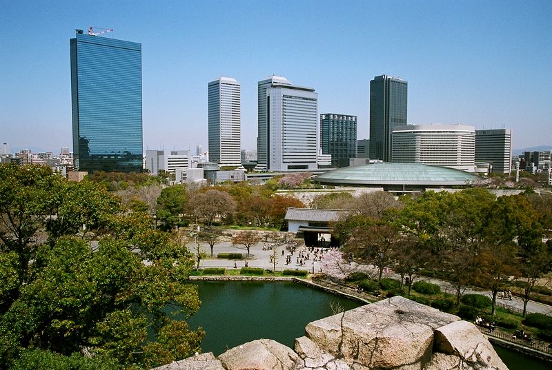 大阪城本丸の定番撮影スポットから見たOBPの超高層ビル群。OBPは青空がよく似合うなぁ~